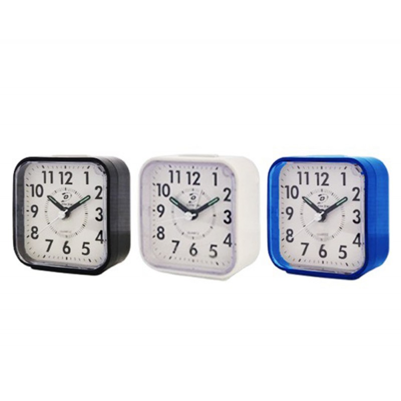 Réveil+Alarme+Lumière et mètre une pile AA (LR6) la forme et carré avec les couleur Blanc et Noir.