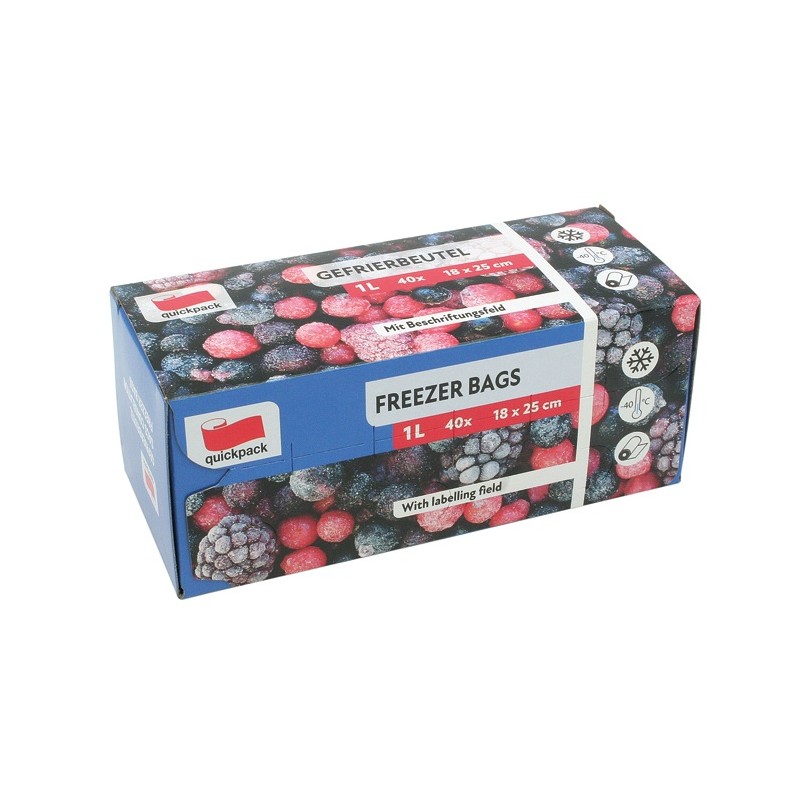 40 sacs congélation 1 litre 18x25cm Résistant à la congélation de -40 °CExtrêmement résistants aux déchirures et élastiques à basse températureProtection efficace contre les brûlures de congélation Adaptés à l’alimentation, inodores et au goût neutreNe contiennent pas de plastifiants